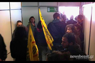 Οι συγκεντρωμένοι, κρατώντας πανό και φωνάζοντας συνθήματα, ανέβηκαν στον 7ο όροφο του κτιρίου με αποτέλεσμα ο διαγωνισμός να ακυρωθεί.