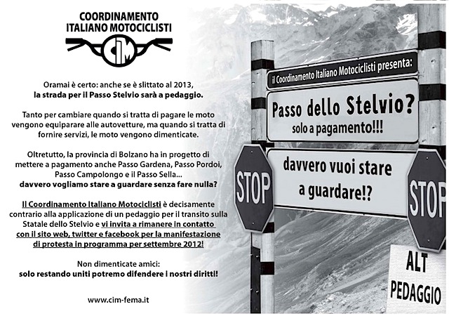 Η Ιταλική Μοτοσυκλετιστική Ομοσπονδία (CIM FEMA) αντιδρά. Έχει δημιουργήσει μια ιστοσελίδα όπου οι ενδιαφερόμενοι μπορούν να υπογράψουν ένα έντυπο διαμαρτυρίας που ζητά να μην επιβληθούν τα διόδια.