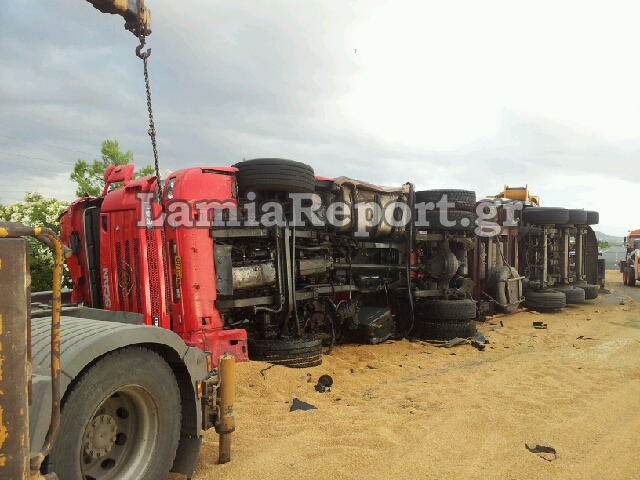 Ο 40χρονος που προηγείται σε μια ελαφριά στροφή χάνει τον έλεγχο και το τεράστιο όχημα ανατρέπεται κάθετα μέσα στην εθνική οδό και ο δρόμος γεμίζει με σιτάρι.