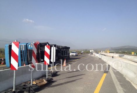 Ενώ η νταλίκα κινούταν στο ρεύμα της ανόδου, για άγνωστη αιτία, βγήκε από το δρόμο, χτύπησε στα δεξιά προστατευτικά τσιμεντένια διαχωριστικά, «πέταξε» στον παράπλευρο δρόμο, όπου και σύρθηκε για αρκετά μέτρα.